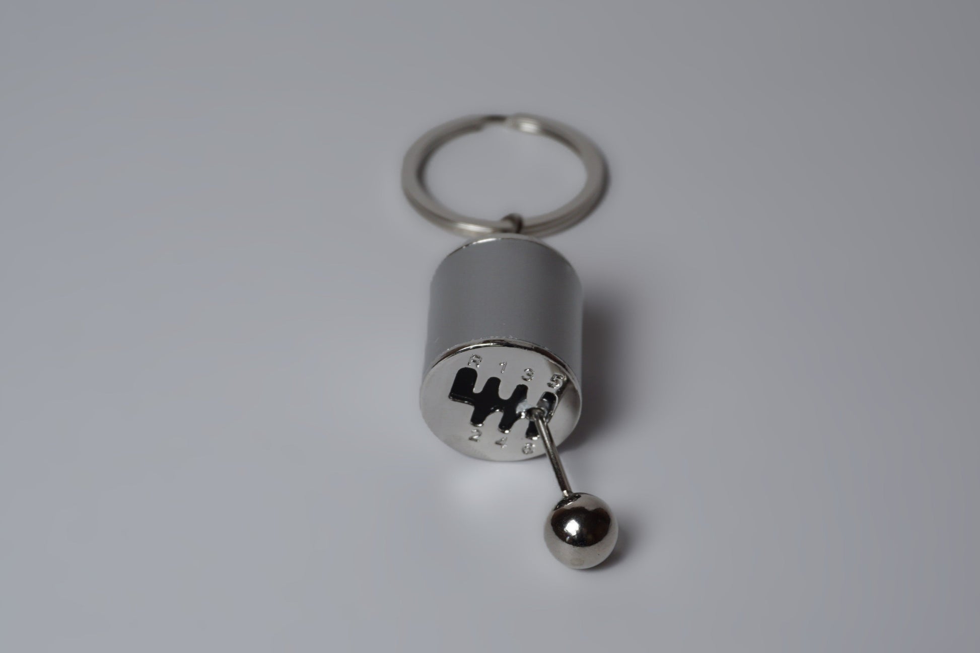 Miniature metal gear shifter keychain with a fully movable stick for interactive shifting. Sturdy and lightweight, perfect for car lovers and driving enthusiasts.