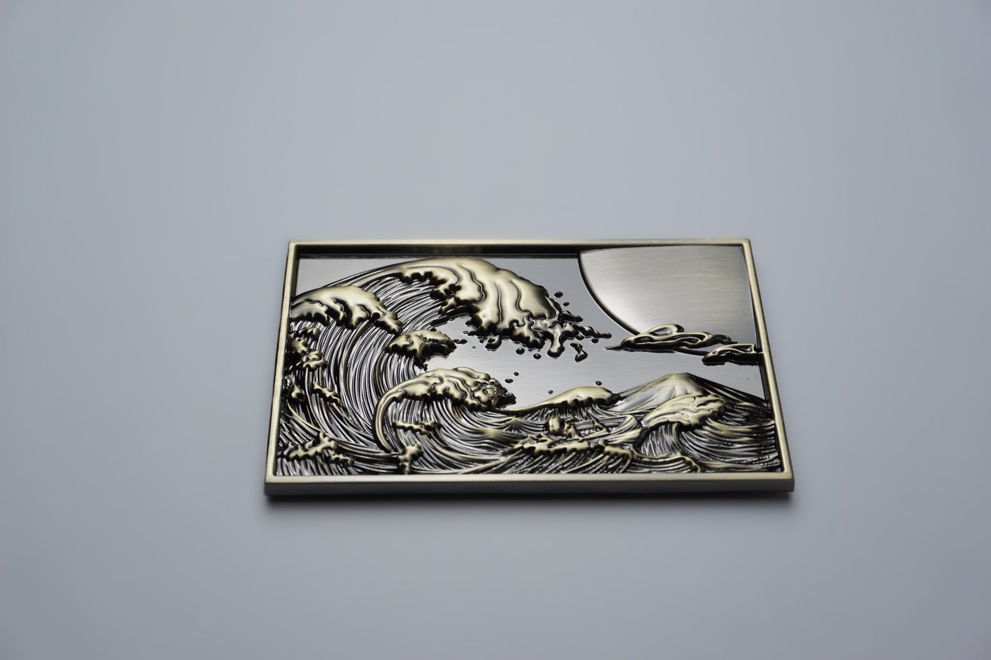 Metallic adhesive plate featuring a detailed wave and mountain design. Made from durable alloy with a brushed finish, perfect for adding a touch of style to cars, laptops, toolboxes, or other smooth surfaces.