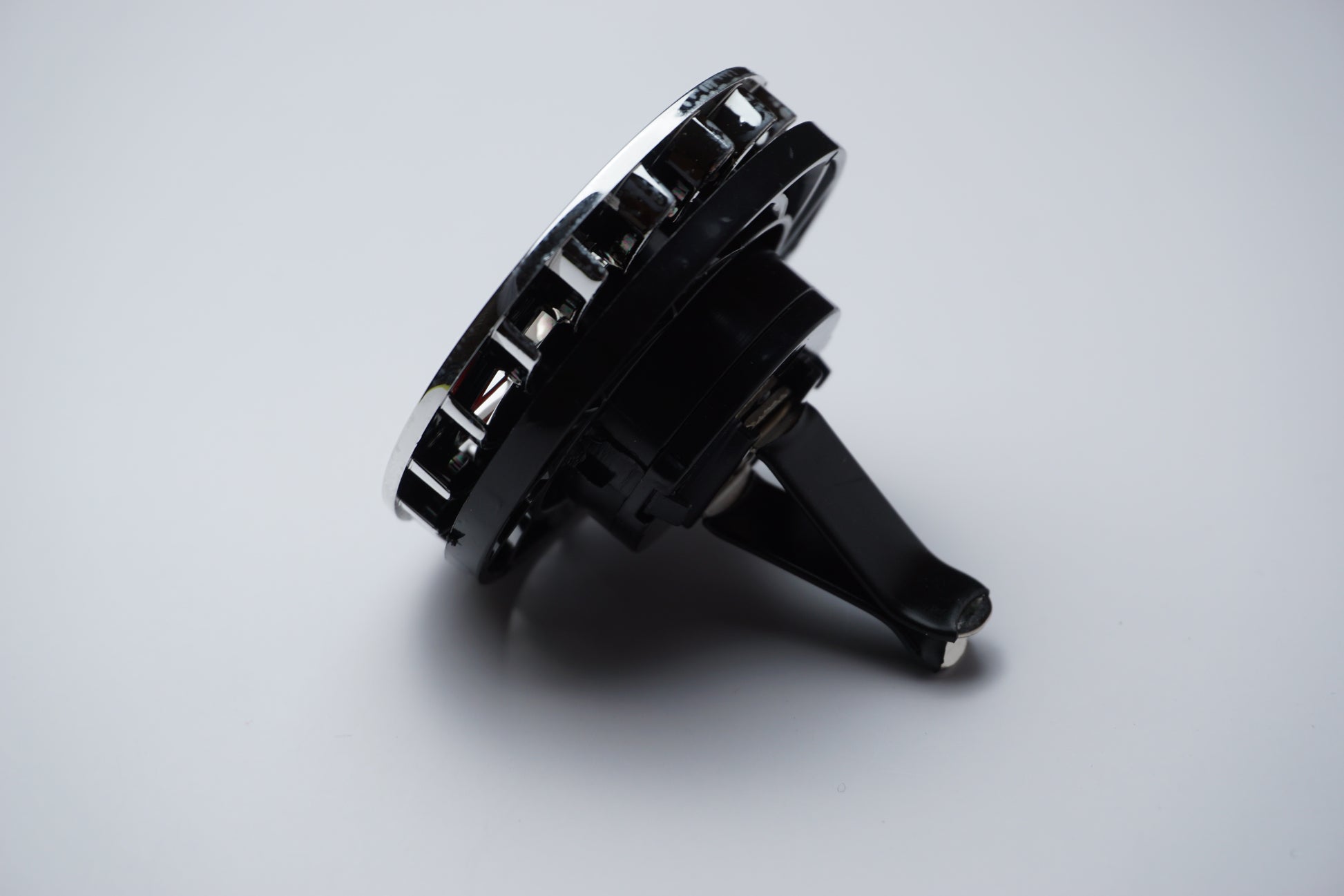 Car air freshener designed as a detailed alloy wheel with a spinnable rim that turns when air flows through your vents. Clips securely onto most air vents and adds a stylish automotive touch while keeping your car smelling fresh.